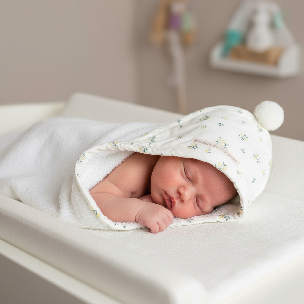 Toalla de suave rizo 100% algodón decorada con un pompón, para el baño de los más pequeños, la piscina o la playa.