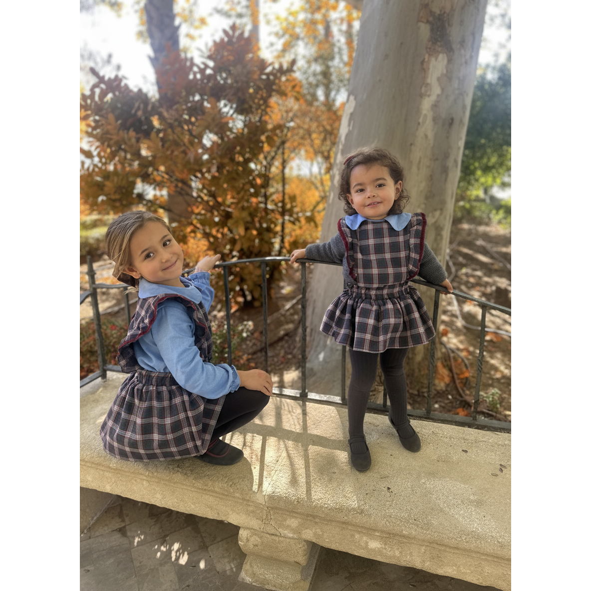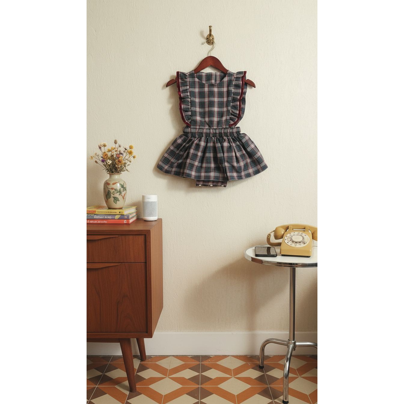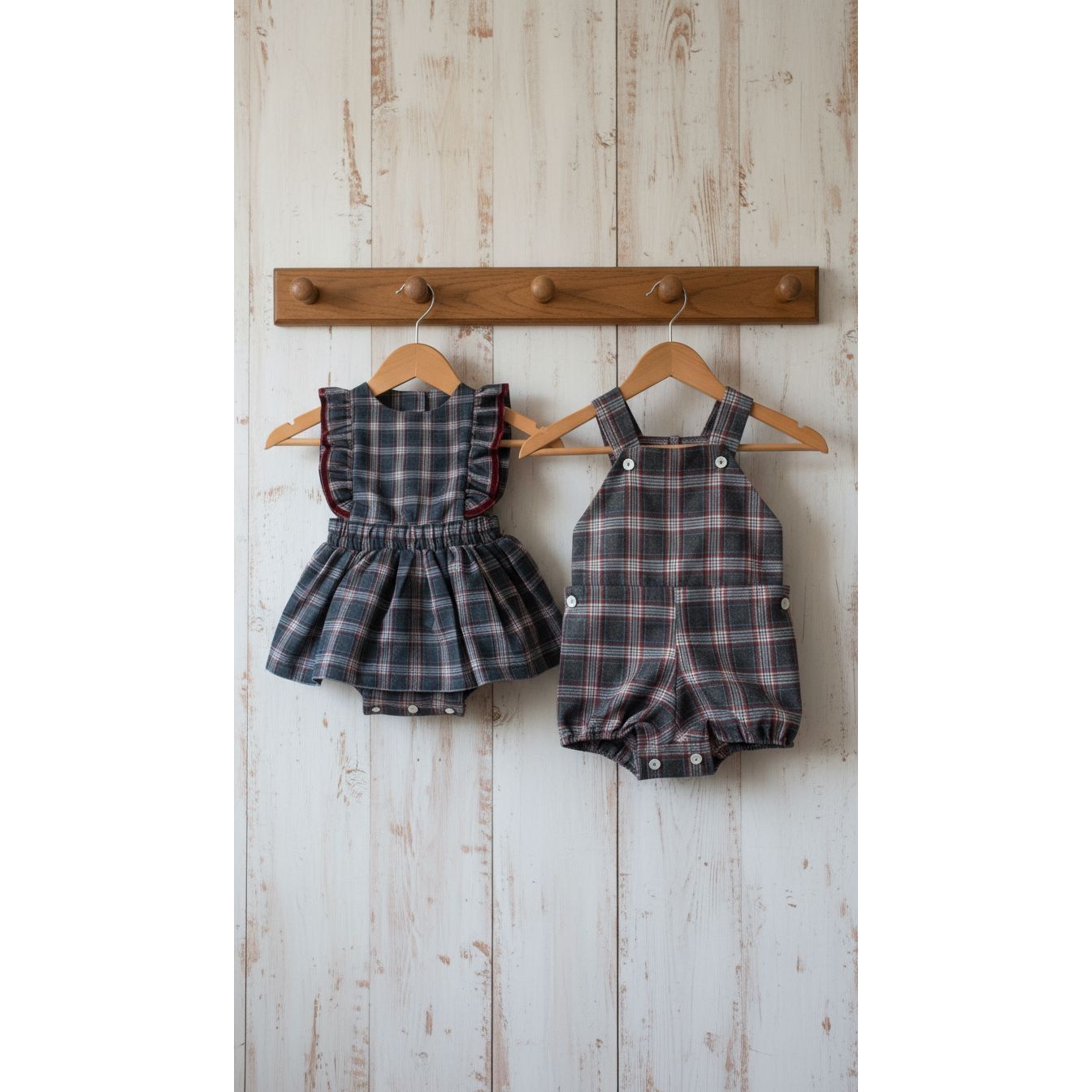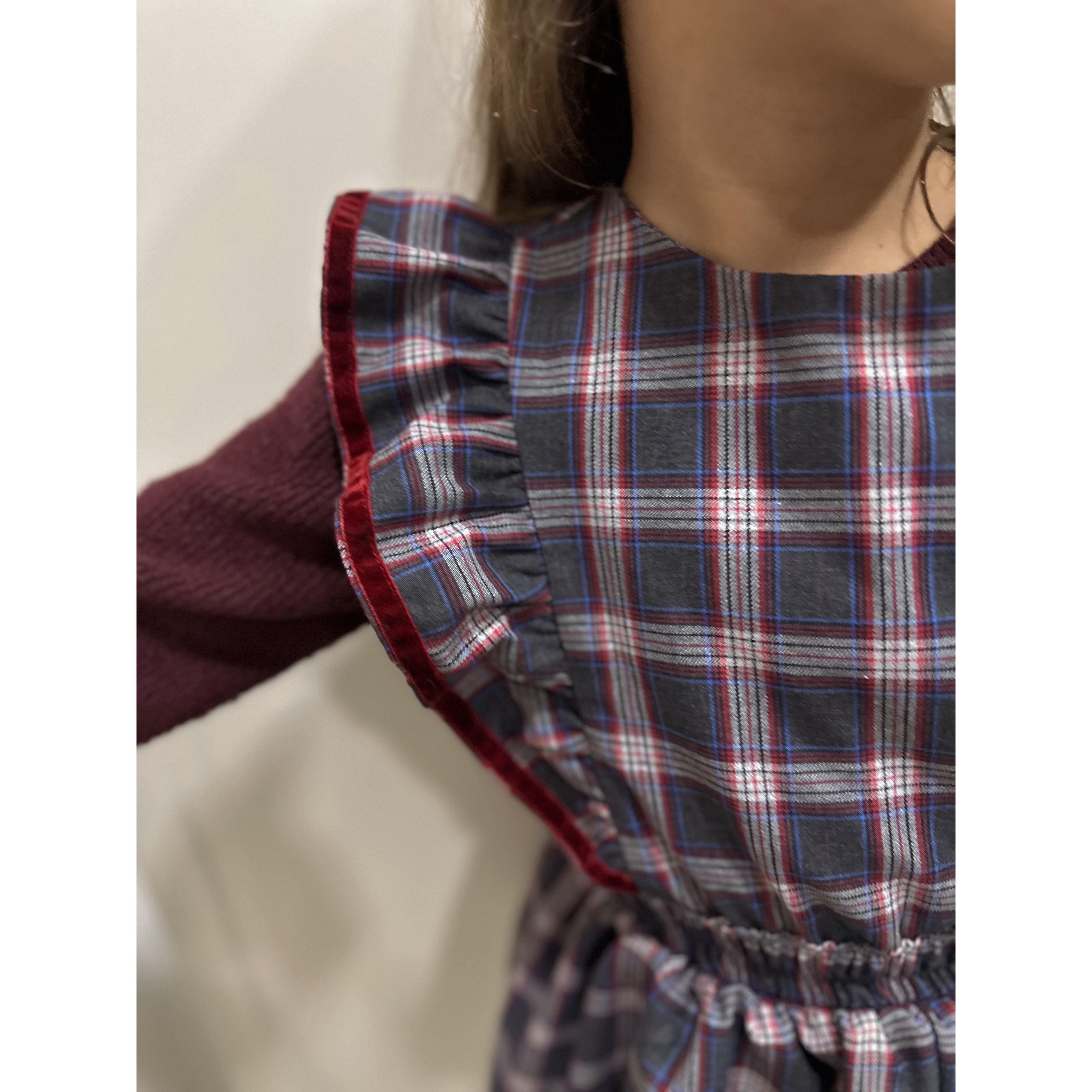Ranita con volante, espalda con botones y elástico en la cintura. Cuadros en tonos gris y terciopelo