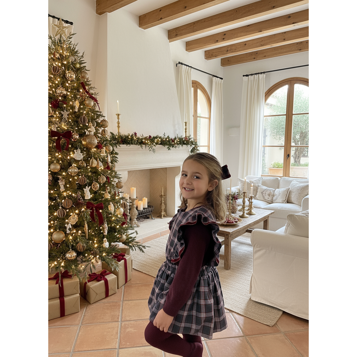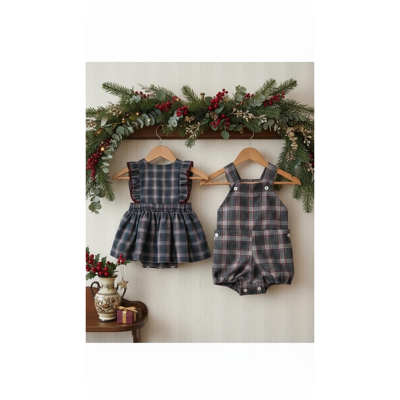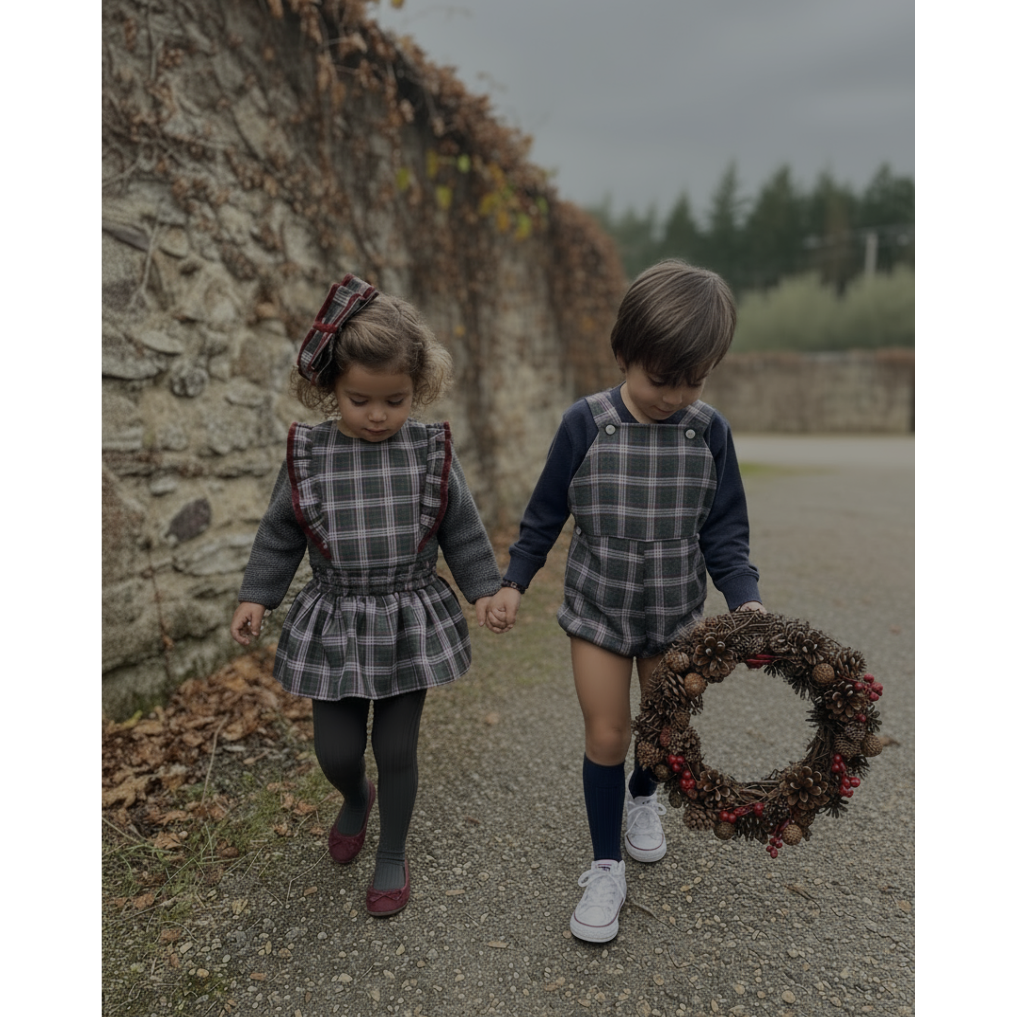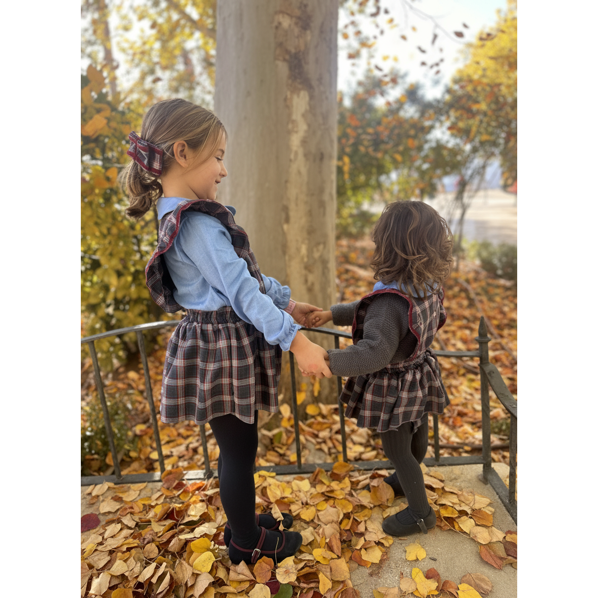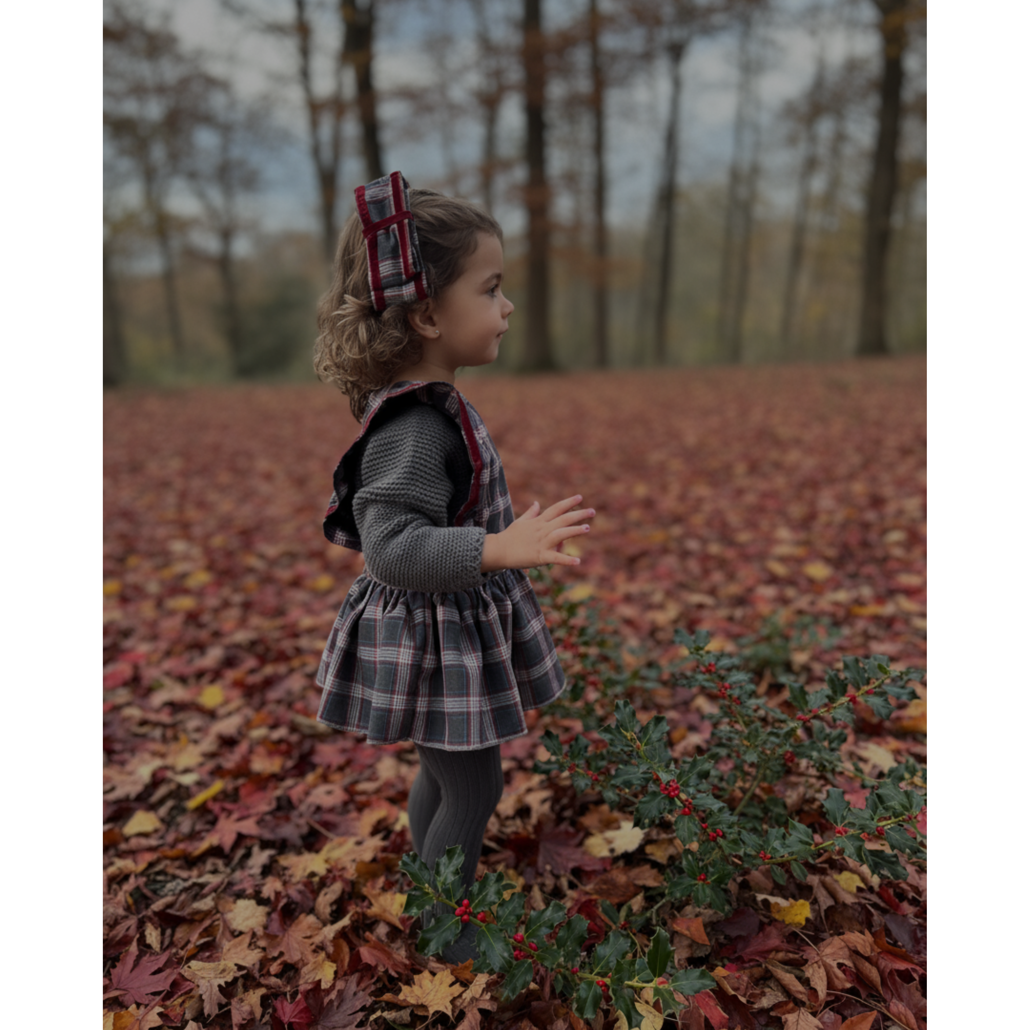 Ranita con volante, espalda con botones y elástico en la cintura. Cuadros en tonos gris y terciopelo