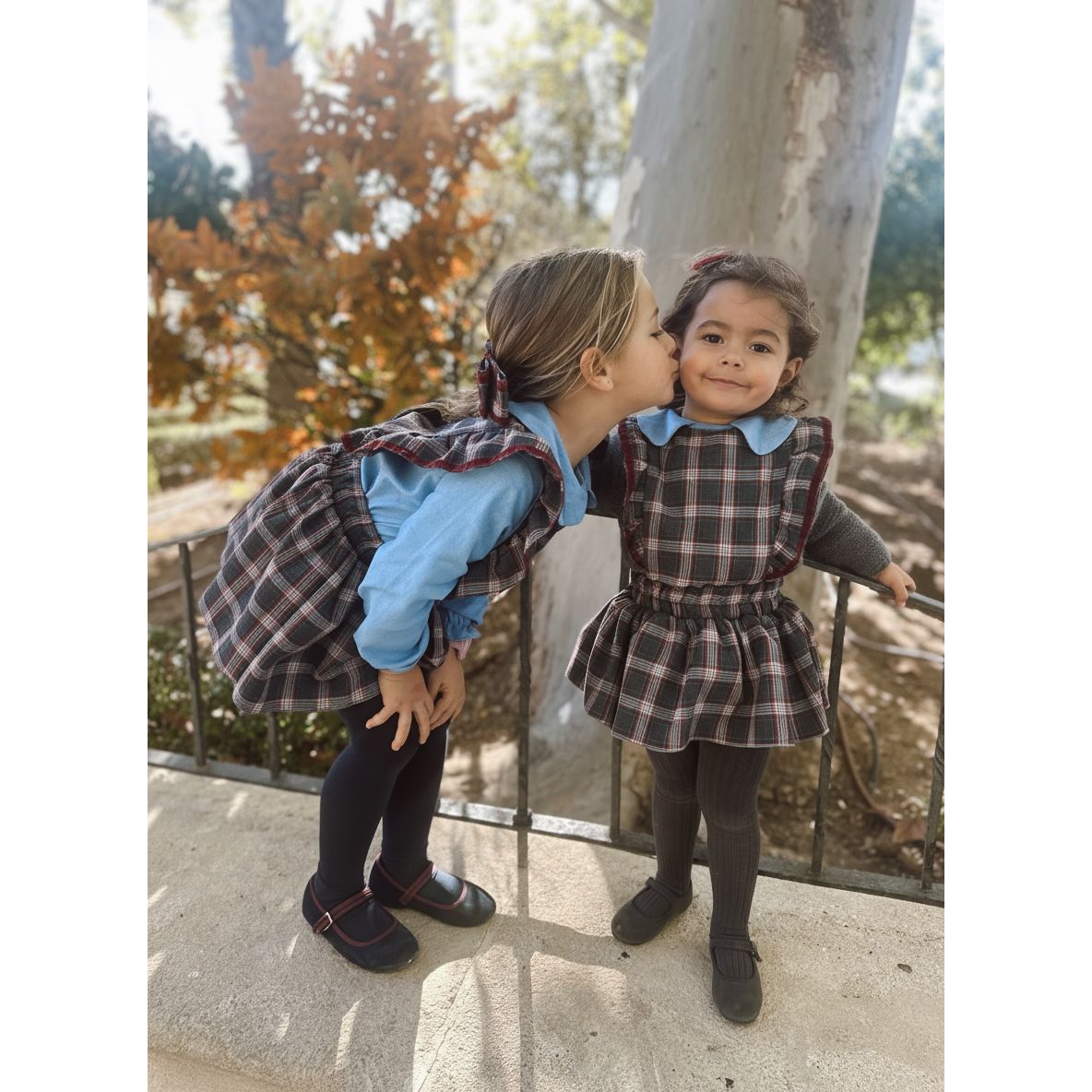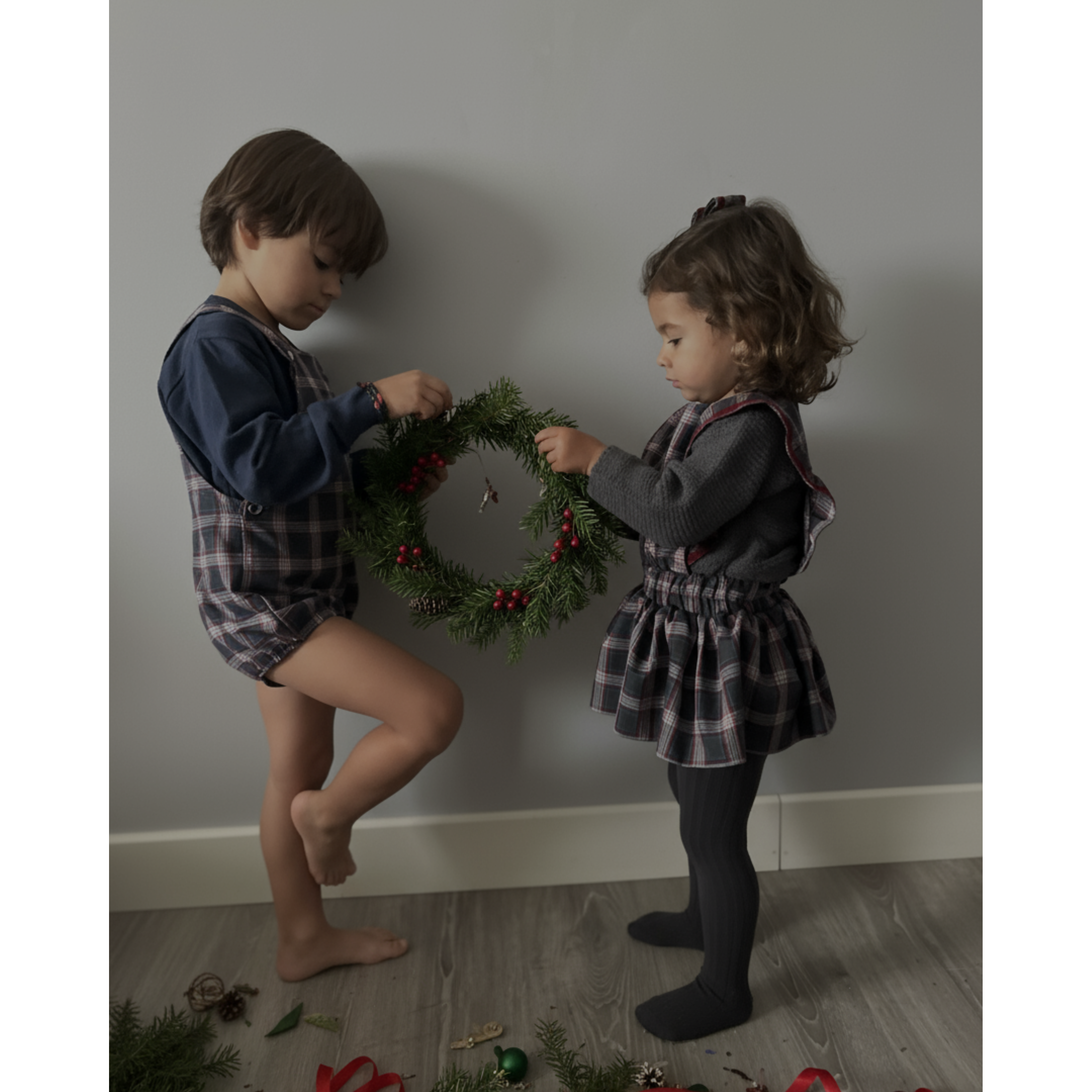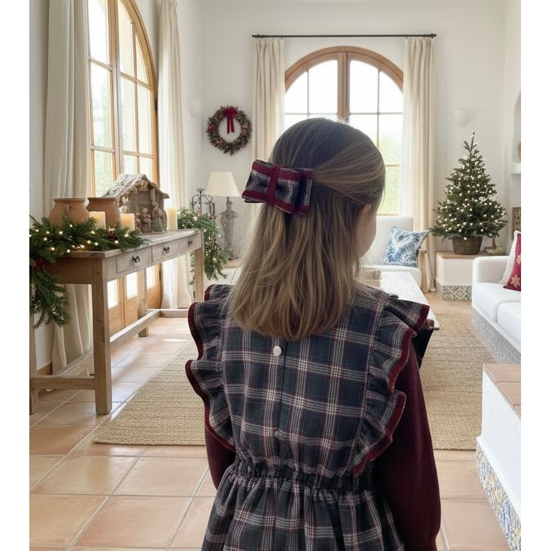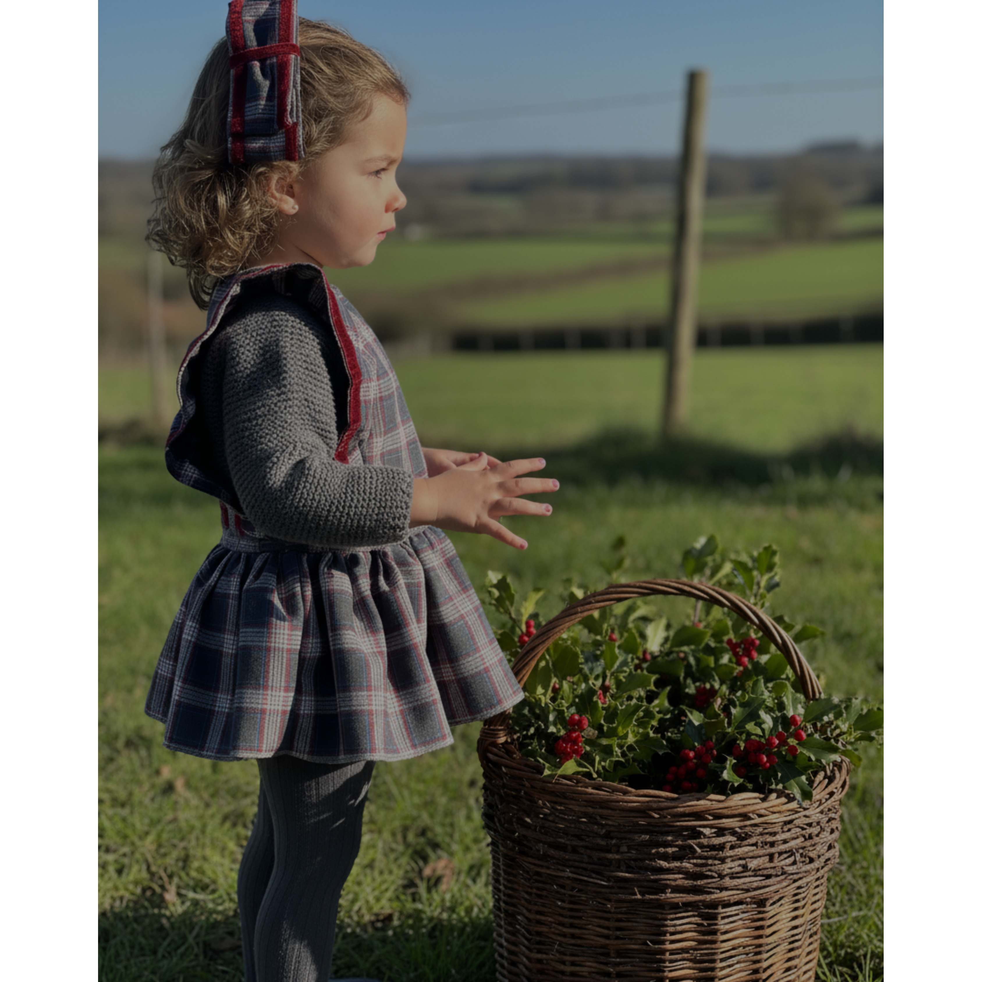 Ranita con volante, espalda con botones y elástico en la cintura. Cuadros en tonos gris y terciopelo