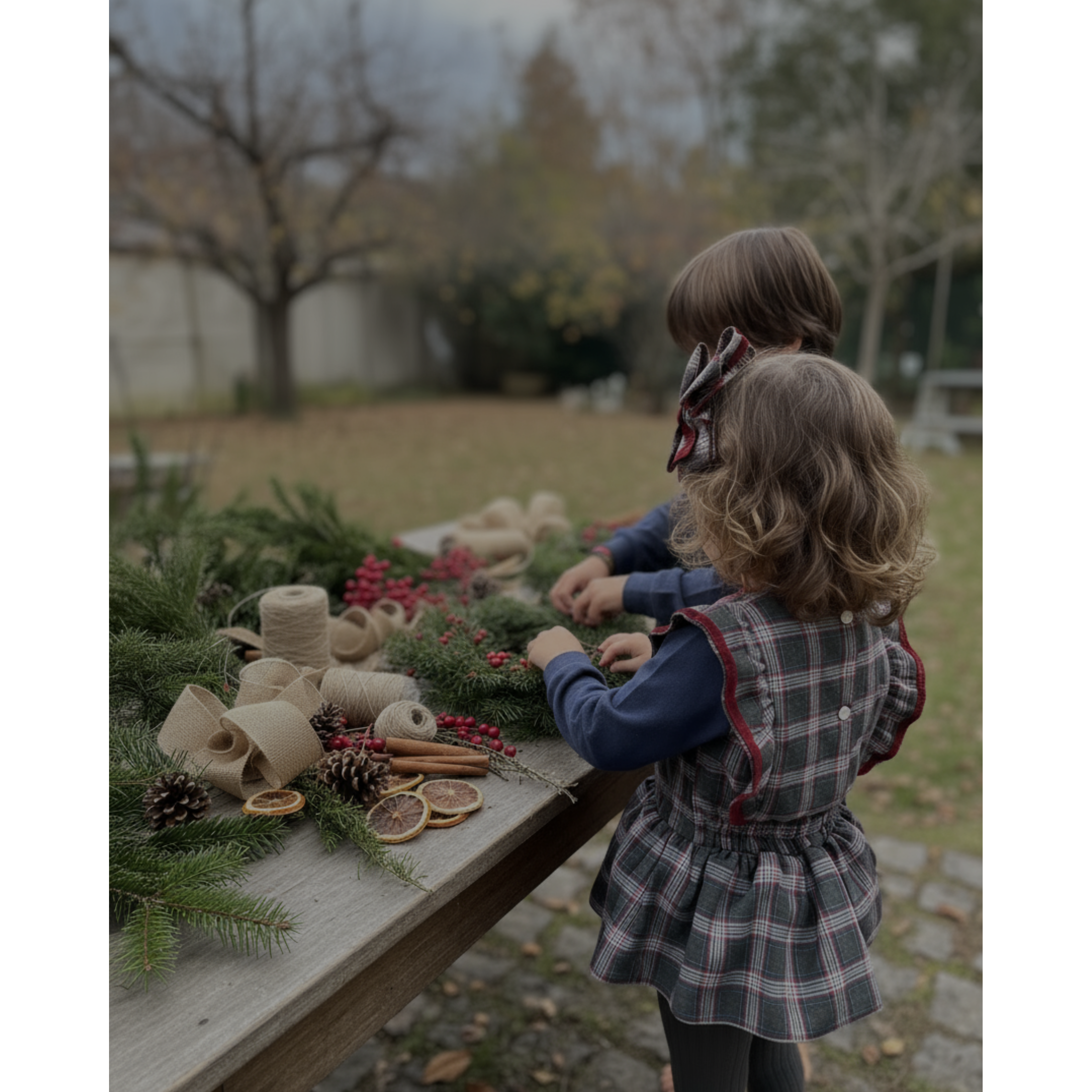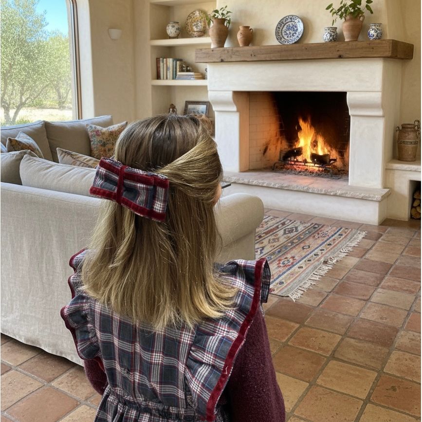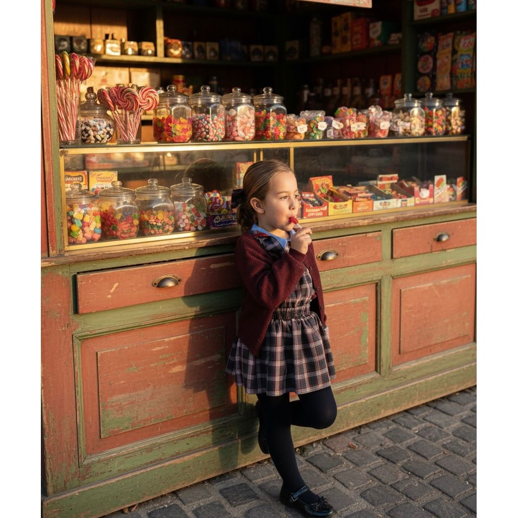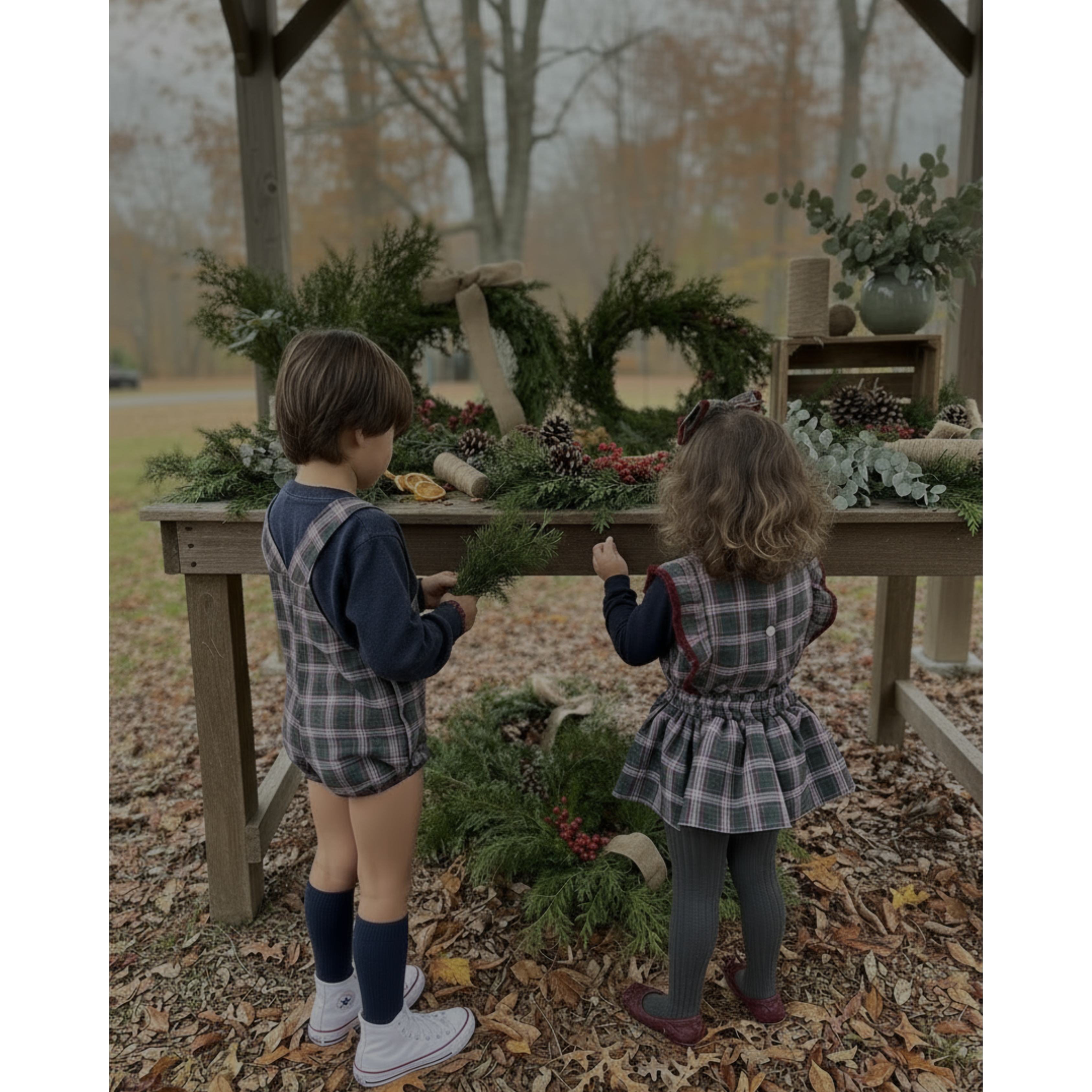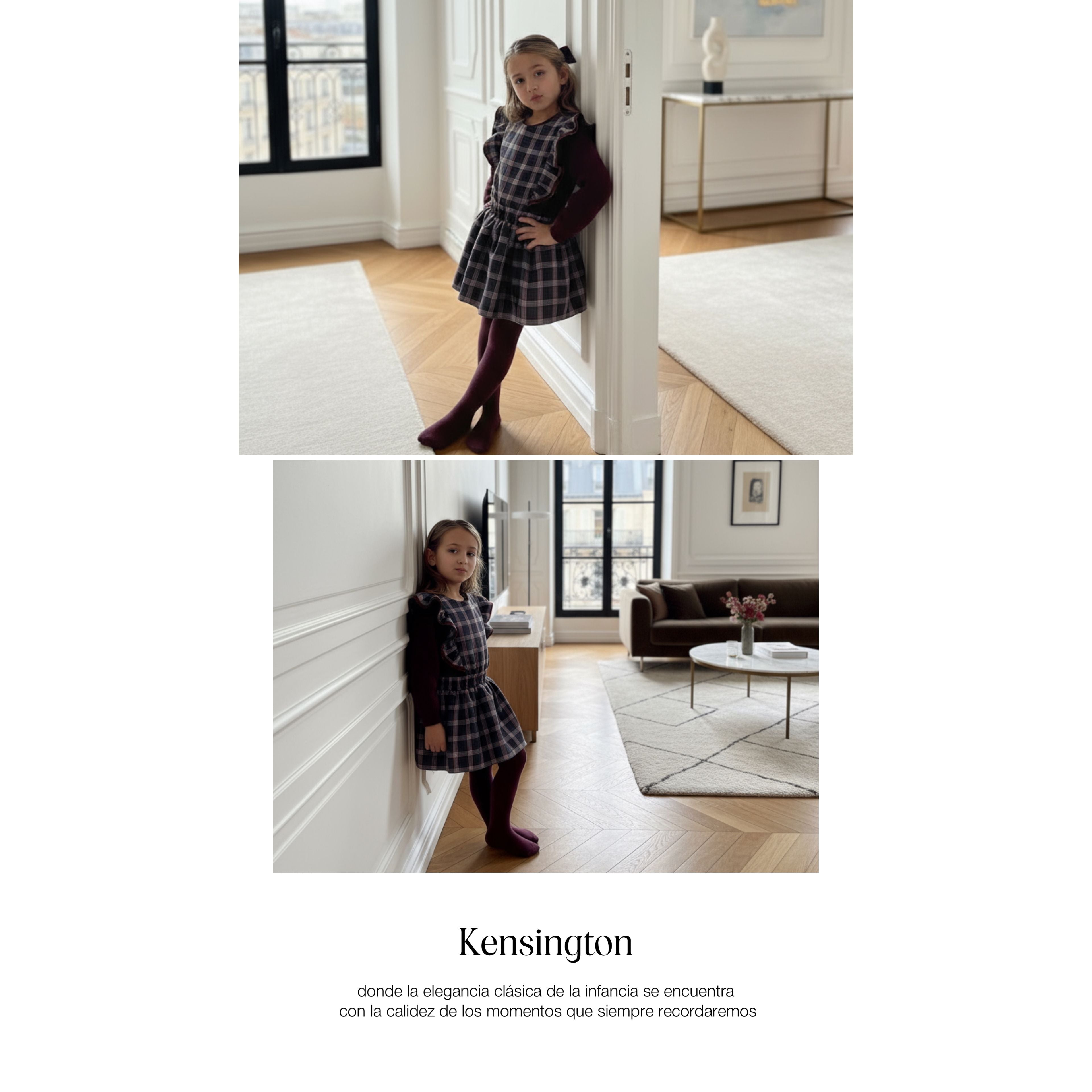 Ranita con volante, espalda con botones y elástico en la cintura. Cuadros en tonos gris y terciopelo