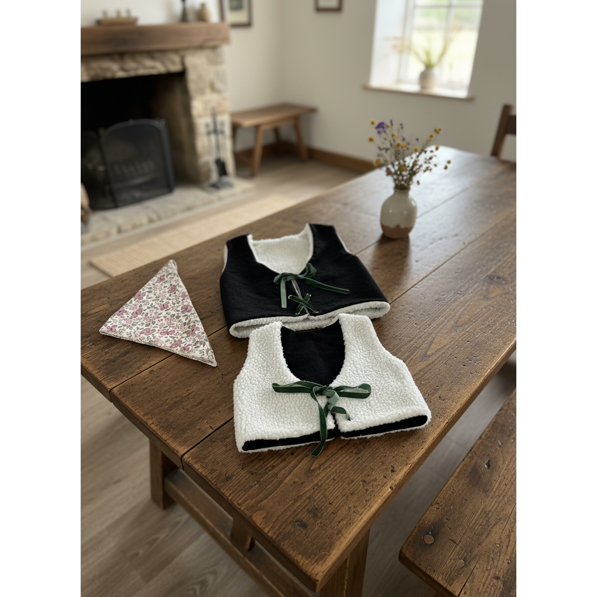 Consta de chaleco reversible, delantal, falda con elástico en la cintura y pañuelo.