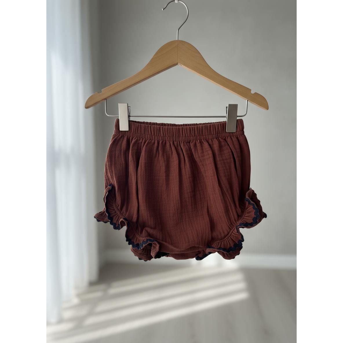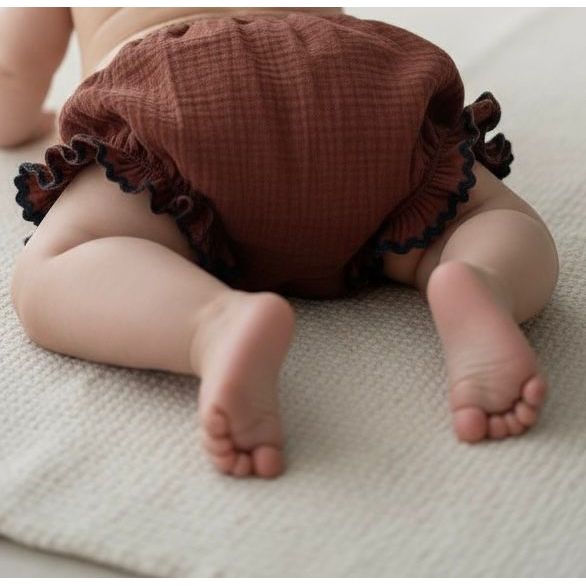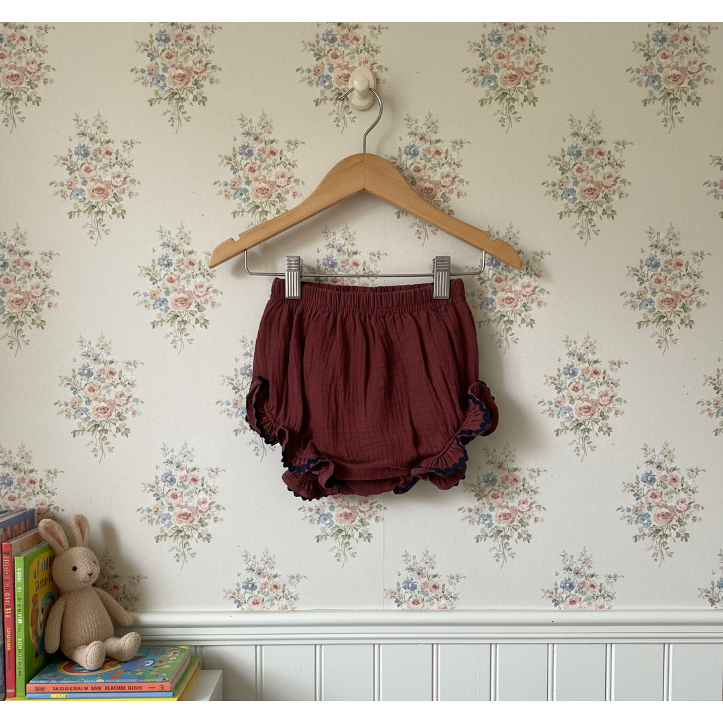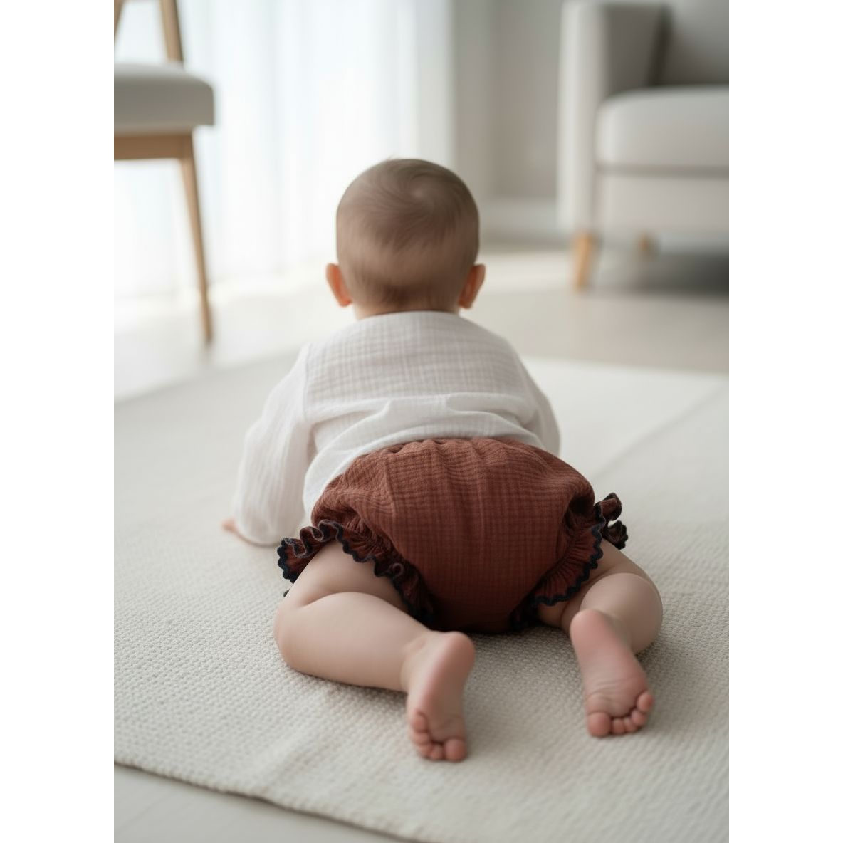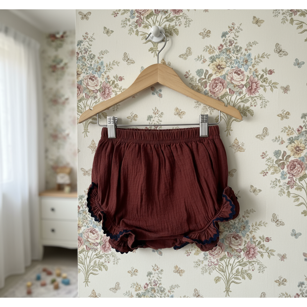 Un clásico del otoño en versión mini. Nuestra ranita Castaña está confeccionada en gasa de algodón, con un tono burdeos profundo que recuerda a los paseos entre hojas secas y meriendas junto al fuego. Su tejido ligero y su cintura elástica la hacen tan cómoda como especial, y los volantes con pespunte contrastado añaden ese toque coqueto que tanto nos gusta en bonjour by Pompoko.