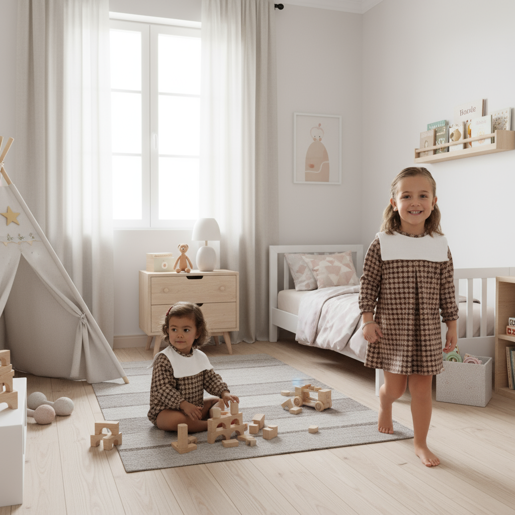 Un vestido lleno de encanto, para niñas que crecen entre risas, hojas secas y tardes de merienda.