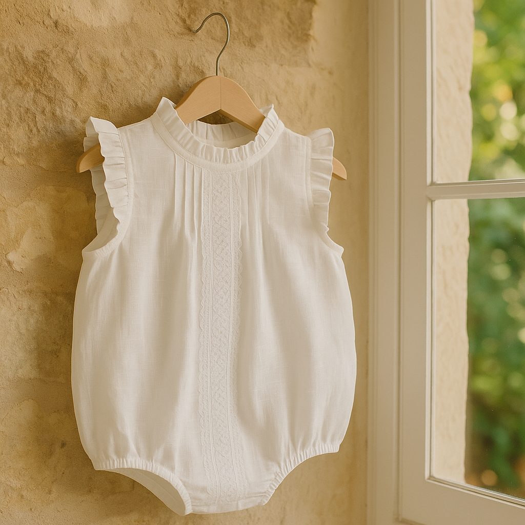 El pelele Blossom es sinónimo de delicadeza y encanto. Confeccionado en un tejido ligero y transpirable, es perfecto para los días más cálidos. Su diseño destaca por un hermoso detalle de encaje en el centro, que aporta un aire romántico y sofisticado sin renunciar a la comodidad.