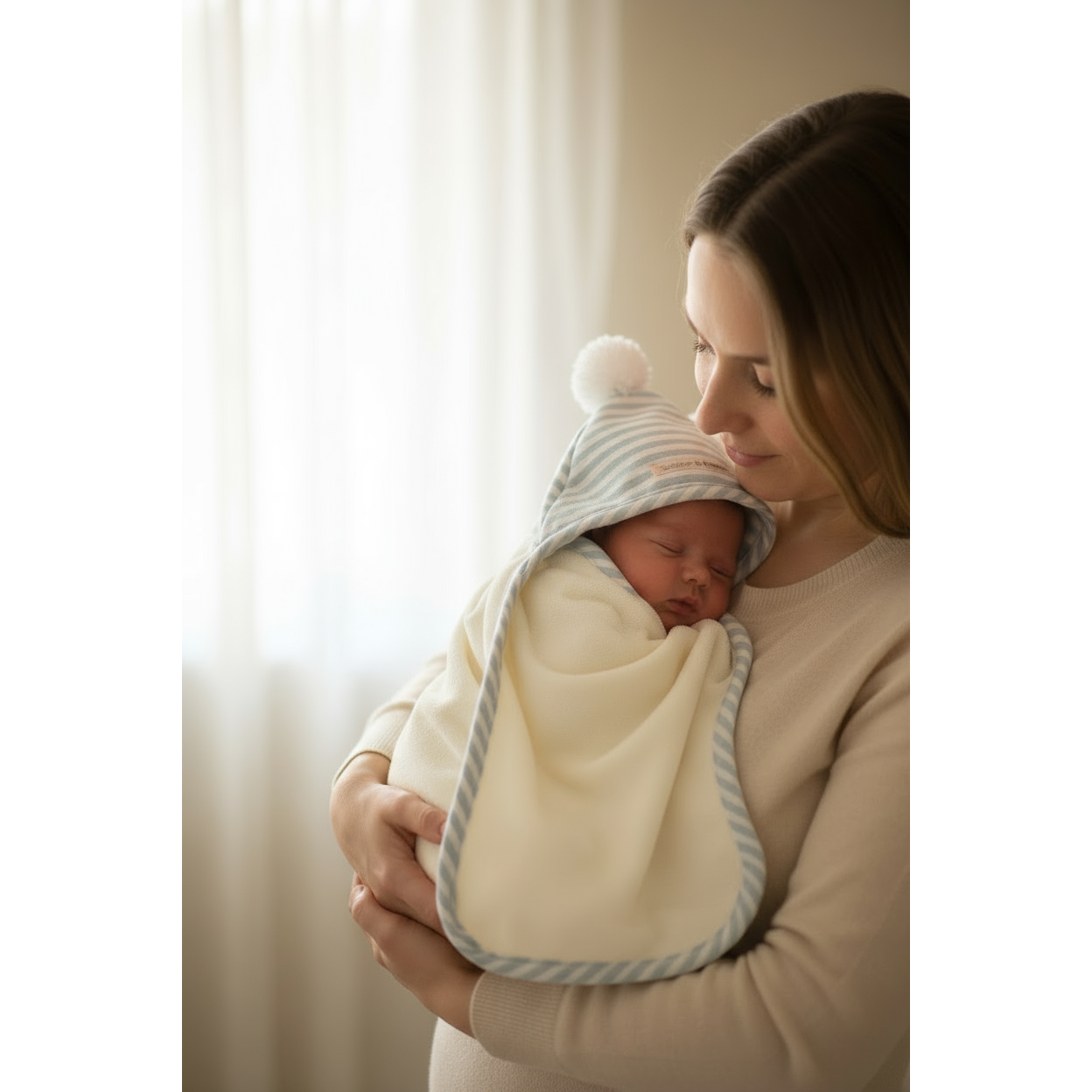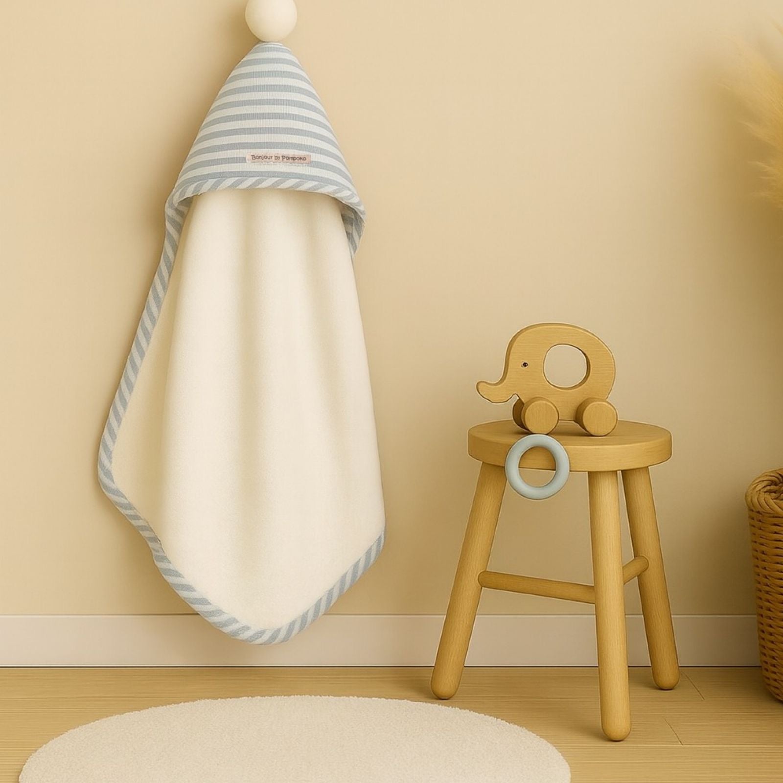 Toalla de suave rizo 100% algodón decorada con un pompón, para el baño de los más pequeños, la piscina o la playa.