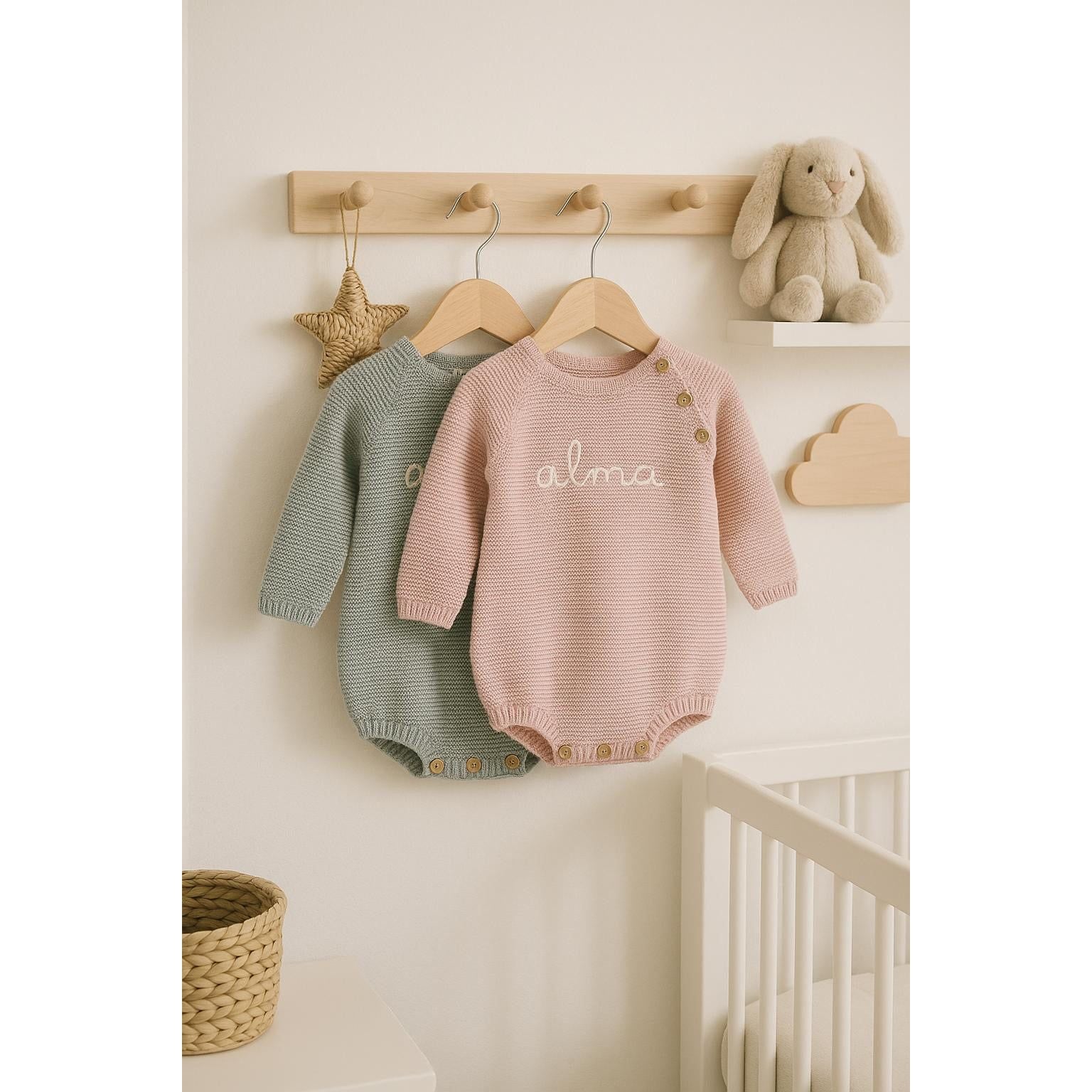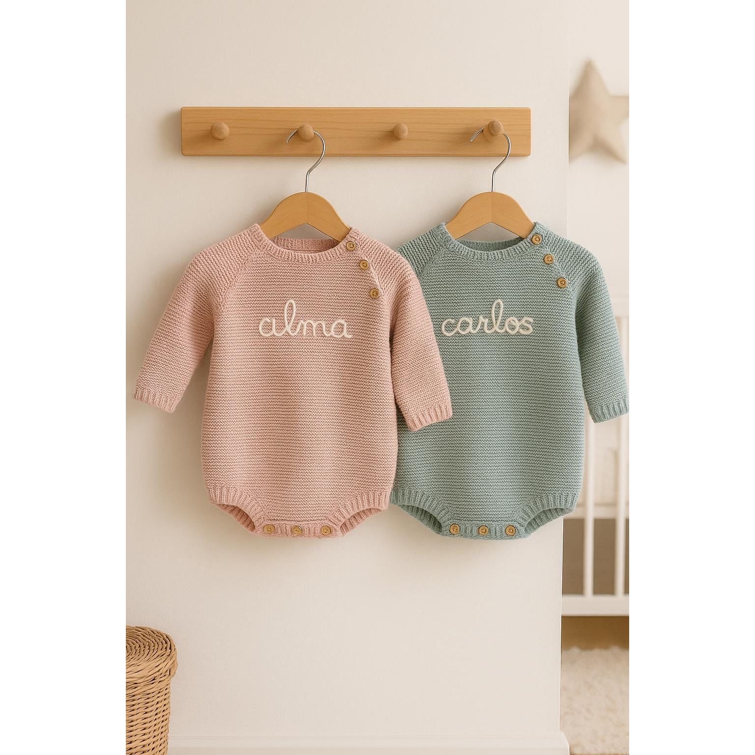 Pelele de punto en manga larga bordado a máquina con su nombre.